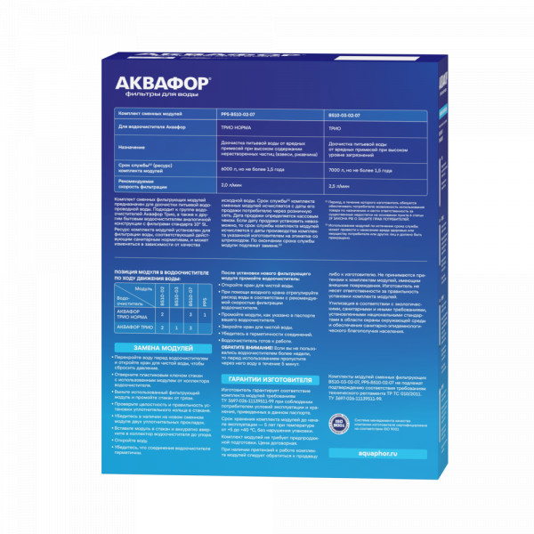 Не забывайте учитывать и срок службы фильтра: он указан в паспорте и определяет, когда модуль нужно заменить, даже если ресурс активной фильтрации в литрах еще есть.7000Механическая фильтрацияЗадерживает ржавчину, ил, песок, как “сито”. Если в фильтре несколько картриджей - первый отсекает самые крупные частицы, а каждый последующий - более мелкие. Существуют картриджи, в которых есть только механическая очистка (полипропиленовые, не “впитывают” растворенные примеси). Они обычно стоят первыми по ходу воды, чтобы продлить жизнь угольным (сорбционным) картриджам, которые ещё и впитывают вредные примеси, как губка.даИонный обменНужен, чтобы умягчать воду, а также задерживать тяжелые металлы. За это отвечают ионно-обменная смола и Аквален (волокна, которые есть во всех фильтрах Аквафор, чтобы устранять тяжелые металлы даже из жесткой воды). Чем больше ионно-обменной смолы - тем лучше фильтр справится с жесткостью. В небольшом количестве она есть во всех фильтрах под мойку. Если же в фильтре есть отдельный картридж, заполненный такой смолой (например, KH), - фильтр помогает умягчать воду. Для слишком жесткой воды (более 5 мкв) лучше выбрать фильтр обратного осмоса.даСорбцияСпособность “впитывать” из воды растворенные, “невидимые” вредные примеси, по принципу губки. Активированный уголь - основной сорбционный материал, который используется в картриджах фильтров для питьевой воды. Например, именно так из воды удаляется хлор.даУмягчениеУдаление из воды солей жесткости (солей кальция и магния, из-за которых образуется накипь в чайнике, белые пятна на посуде, известковый налет). Фильтры обратного осмоса абсолютно умягчают воду с любой концентрацией солей (то есть удаляют соли жесткости полностью). Проточные фильтры со специальными картриджами рекомендуются только для умягчения воды средней жесткости (той, в которой средняя концентрация солей кальция и магния - до 5 млэкв/литр).нетПрименениедля холодной водыФильтрует частицы крупнее, мкмЧем меньше цифра, тем более мелкие частицы способен задержать фильтр. Например, любой фильтр под мойку справится с ржавчиной, илом и песком, но не каждый - с бактериями (на это способен картридж с половолоконной мембраной и системы обратного осмоса). Если в фильтре несколько картриджей - первый отсекает самые крупные частицы, а каждый последующий - более мелкие. Цифра указана для картриджа самой тонкой очистки.1,0Давление в водопроводе не более, атмМаксимальное давление воды на входе в систему, при котором возможна стабильная работа фильтра.6,5Защита от бактерийВсе проточные фильтры в той или иной степени защищают от бактерий. Например, добавление серебра препятствует их размножению. Это стандартная степень защиты. Если в семье есть дети, пожилые люди или аллергики, воду рекомендуется обеззараживать, то есть полностью удалять микроорганизмы. Повышенную защиту от бактерий дают фильтры с половолоконной мембраной. Это пучок трубок с порами размером 0,1 микрон (что в 1000 раз тоньше человеческого волоса) - бактерии и яйца паразитов “застревают”, как в “сите”. Полученную воду не придется кипятить и можно использовать для приготовления детского питания. Абсолютную защиту обеспечат фильтры обратного осмоса, которые не пропускают через обратноосмотическую мембрану ничего, кроме воды.стандартнаяСкорость 