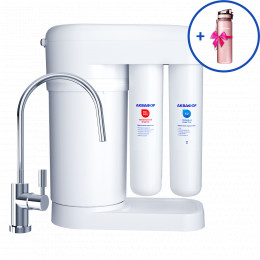 Инновационный водоводяной бак экономит до 9 тонн воды в год относительно классических обратноосмотических систем с водовоздушным баком. Он намного компактнее обычного, поэтому Морион занимает в 2 раза меньше места под мойкой, чем стандартная обратноосмотическая система. Скорость набора воды у Мориона в 2 раза выше, чем у классического обратноосмотического фильтра.